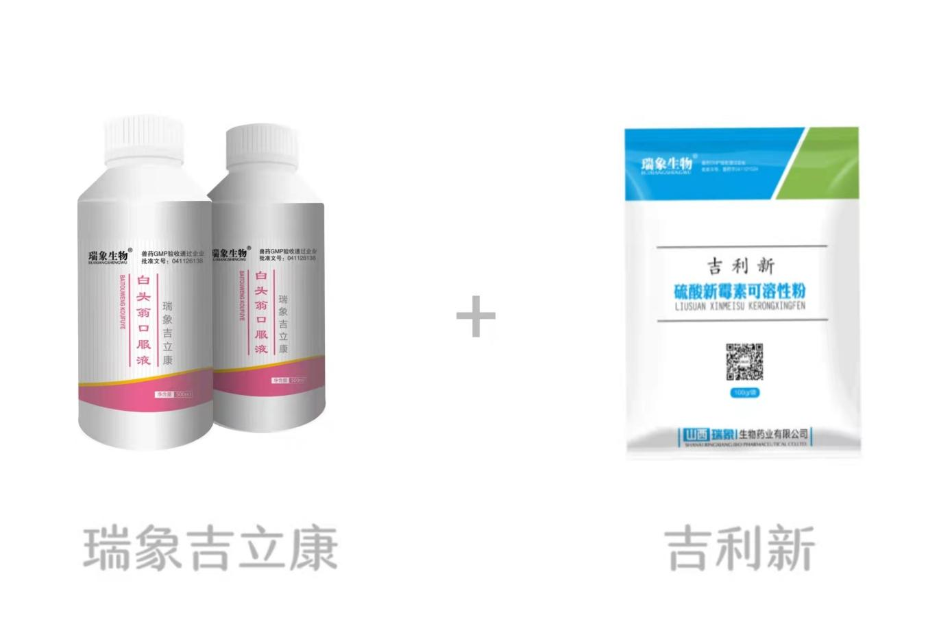 使用方法:瑞象吉立康(500ml兌水500斤)+吉利新(100g兌水600斤)集中飲用4-6小時(shí),連用3-5天。