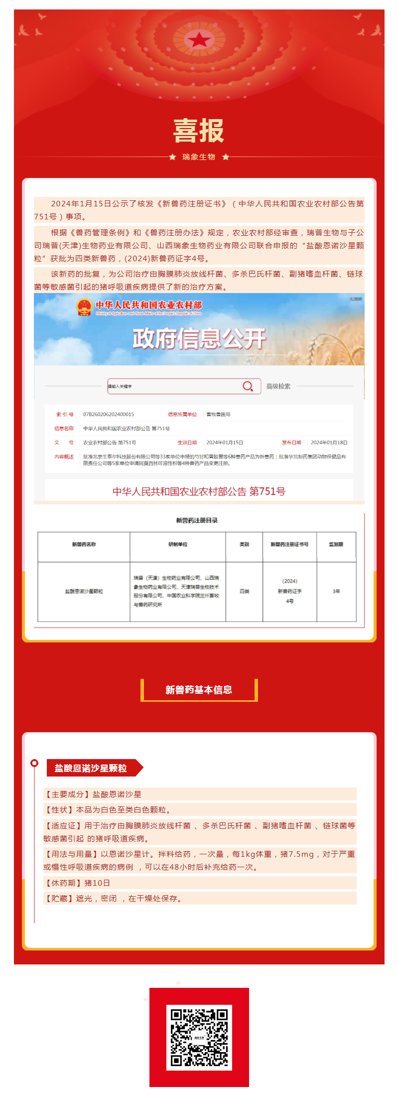【喜報(bào)】瑞象生物“鹽酸恩諾沙星顆?!鲍@新獸藥證書!